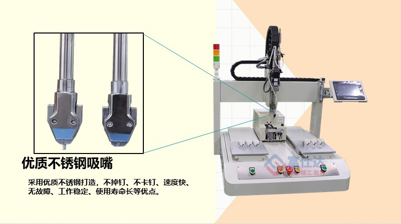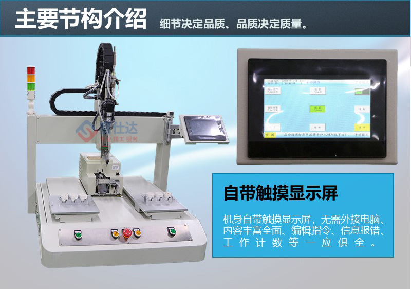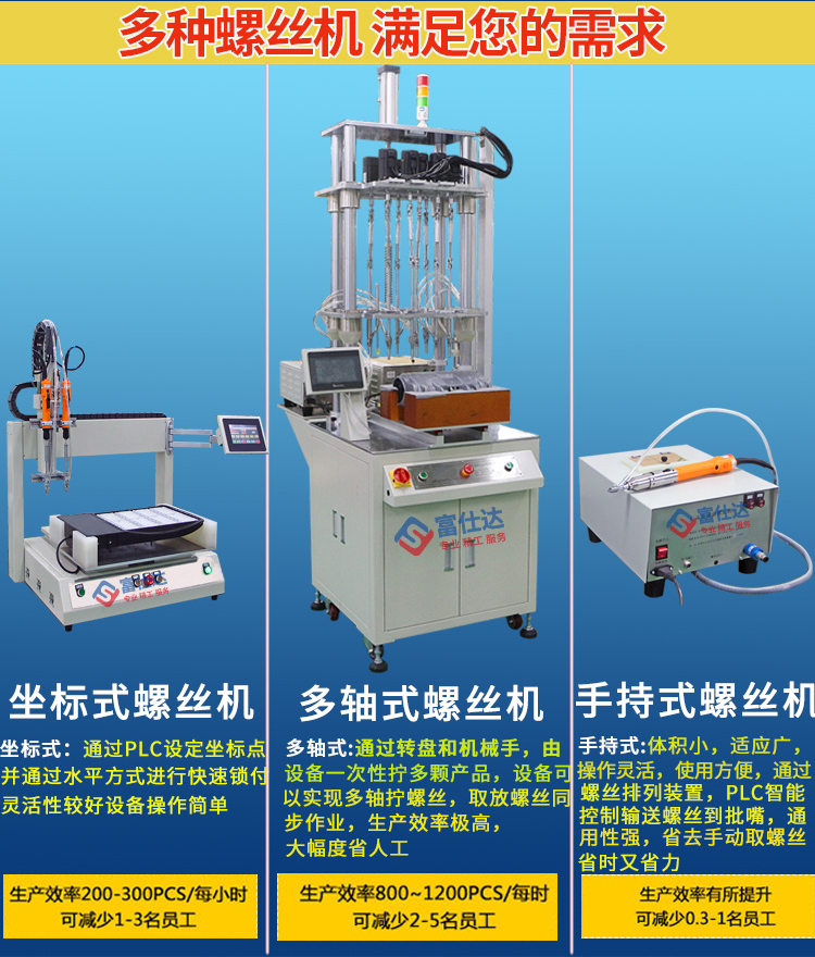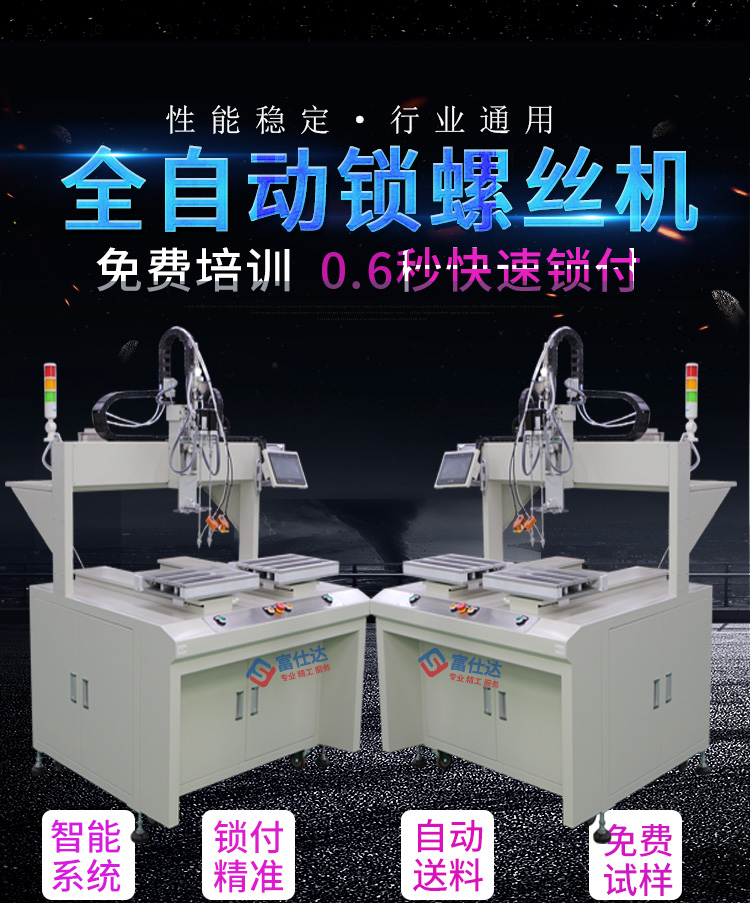 雙平臺(tái)坐標(biāo)式自動(dòng)打螺絲機(jī),即富仕達(dá)雙工位全自動(dòng)鎖螺絲機(jī),設(shè)備主要由自動(dòng)送釘機(jī)、逐點(diǎn)鎖付系統(tǒng)、PLC控制系統(tǒng)、鎖螺絲機(jī)智能控制程序等構(gòu)成,通過對(duì)產(chǎn)品螺絲孔位X\Y\Z三維坐標(biāo)點(diǎn)位,執(zhí)行鎖付系統(tǒng)定位,重復(fù)定位精度較高:±0.02mm,適合螺絲密集型產(chǎn)品及型號(hào)多樣產(chǎn)品生產(chǎn)要求。