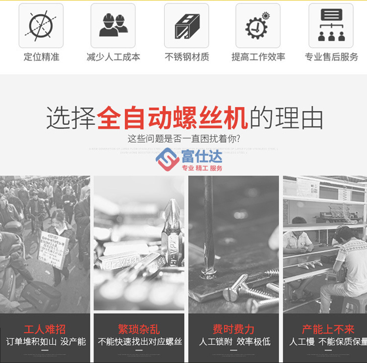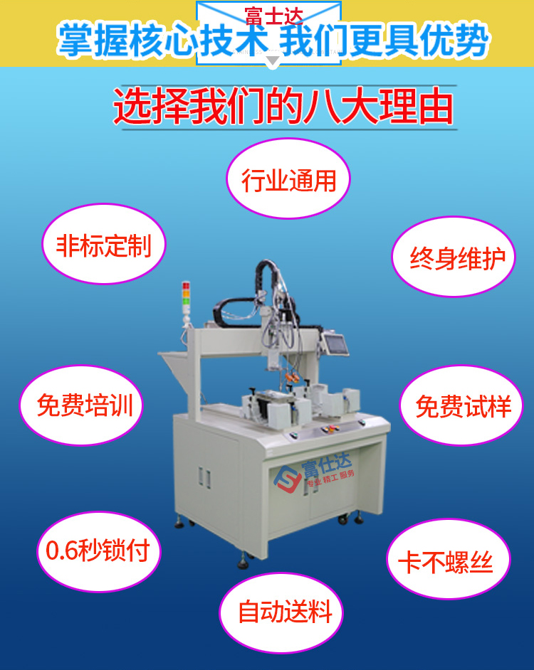 富仕達(dá)擁有獨(dú)立研發(fā)設(shè)計(jì)團(tuán)隊(duì),200多位自動(dòng)化高級(jí)工程師,5000㎡自動(dòng)鎖螺絲機(jī)生產(chǎn)、測(cè)試車間,專業(yè)售后服務(wù)團(tuán)隊(duì),為客戶提供方案設(shè)計(jì)、設(shè)備制造、操作培訓(xùn)、售后服務(wù)等一站式服務(wù)。 公司將持續(xù)提升技術(shù)創(chuàng)新和產(chǎn)品服務(wù)方面的優(yōu)勢(shì),堅(jiān)持“專業(yè)、精工、服務(wù)”的企業(yè)理念,聚焦于自動(dòng)鎖螺絲設(shè)備生產(chǎn),通過系統(tǒng)的一站式解決方案,真正的幫助客戶提升效率、降低成本,提升客戶的核心競(jìng)爭(zhēng)力。