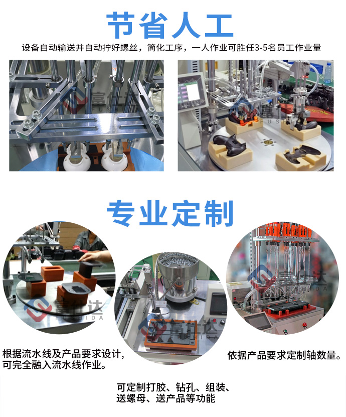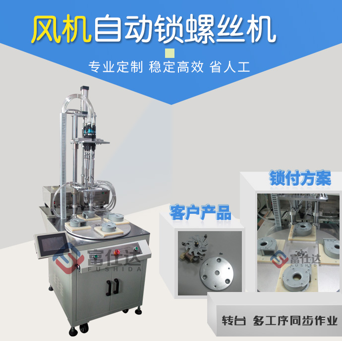 罩極風(fēng)機(jī)外殼采用6顆螺絲緊固,這里配置3臺(tái)自動(dòng)送釘機(jī),并設(shè)計(jì)專用治具來固定工件,保證鎖付標(biāo)準(zhǔn)。設(shè)備可一次自動(dòng)擰好產(chǎn)品的6顆螺絲,轉(zhuǎn)臺(tái)可實(shí)現(xiàn)多工位同步作業(yè),擰好一件產(chǎn)品僅需3秒左右,一人作業(yè)即可,可節(jié)省3-5名員工。